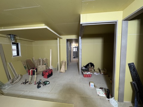土間コンクリートを打設し、1階型枠の建て込みと2階梁配筋が完了しました。