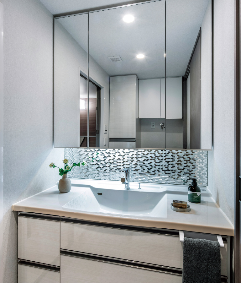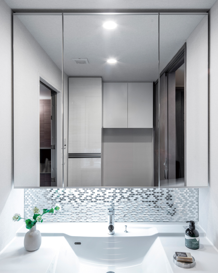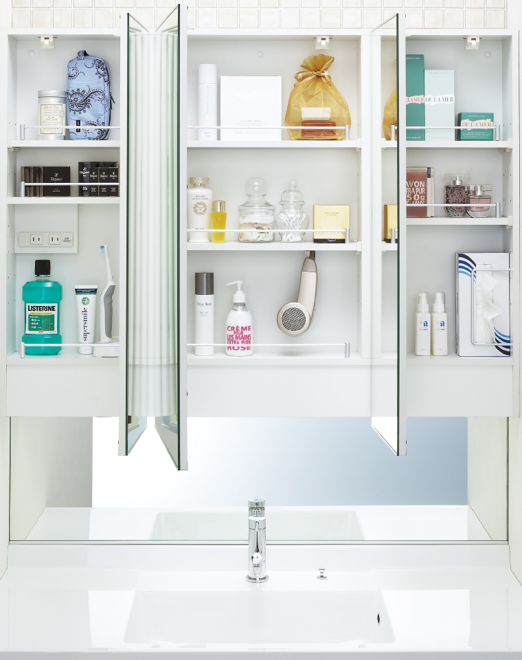 身支度がはかどる便利な三面鏡を採用。鏡内の収納部分には、よく使う小物やパーソナルケア用品などを収納できるのでとても便利です。