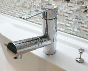 水量・湯量の調整が簡単なシングルレバー混合水栓。ヘッドのノズルが伸びるので、洗面ボウルのお掃除等にとても便利です。