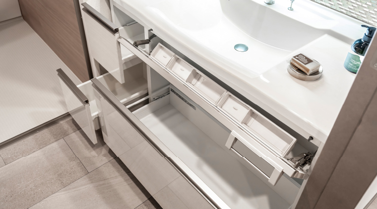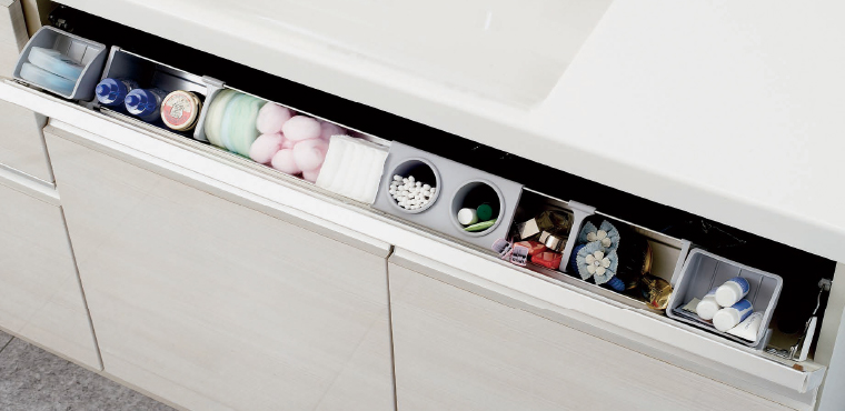 メイク道具などをラクな姿勢ですばやく取り出せるアイデア収納。散らかりがちなメイク道具をきれいに整頓して収納できます。