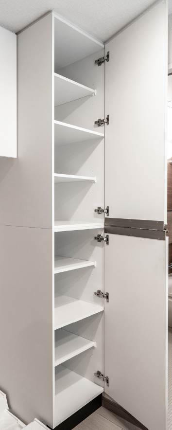 浴室や洗面室で使用するリネン類や洗剤などをすっきり収納できる物入を設置しました。