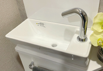 トイレ内には独立した手洗いカウンターを設置。アクアオート(自動水栓)で、器具に触れずに水の出し止めができるので衛生的です。